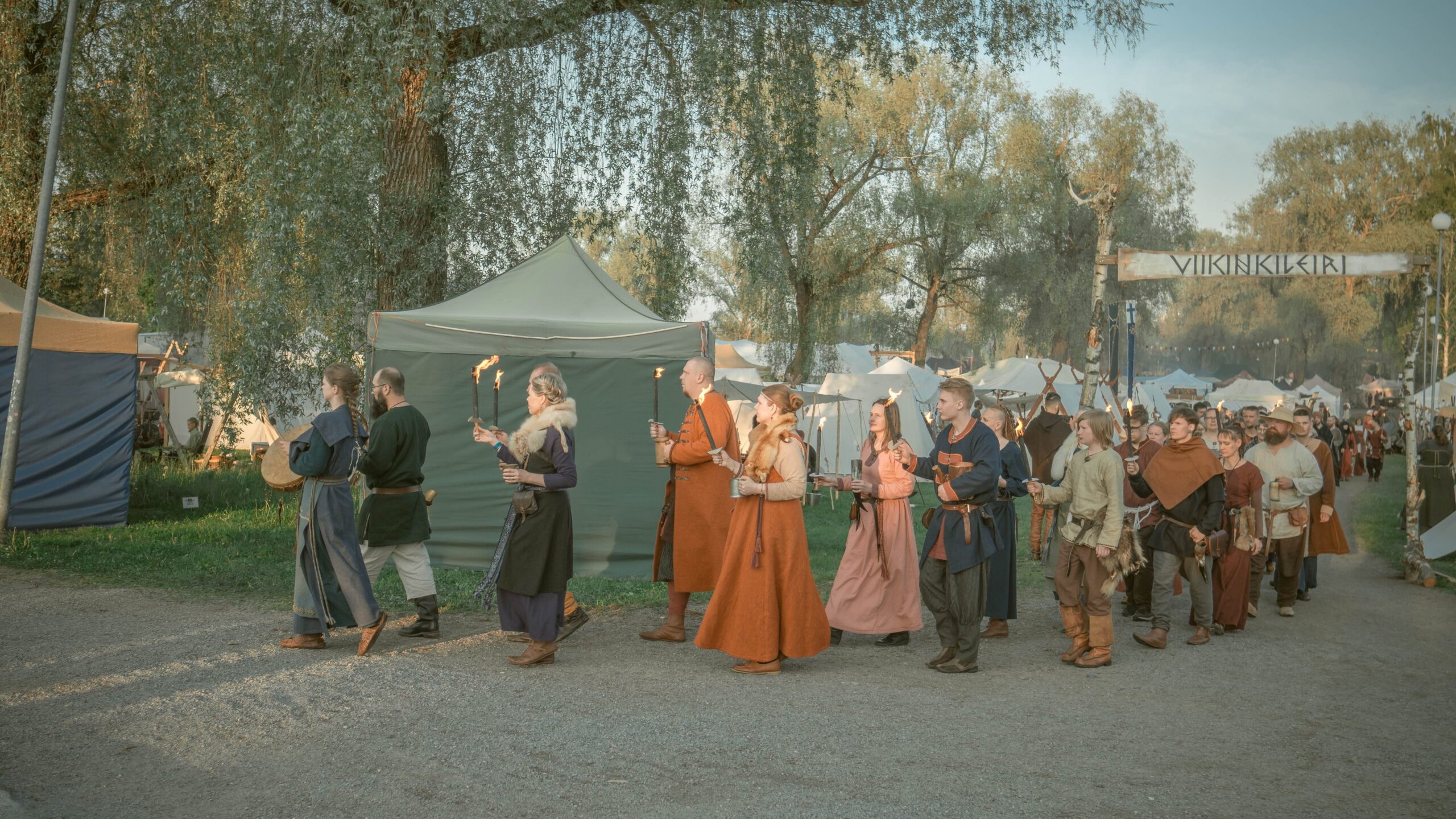 Perjantaina 12.6.2026 noin klo 21.00 kokoamme viikingit soihtukulkueeseen, joka kiertää viikinkikylän ja päätyy uhrilehtoon. Viikingit ovat pukeutuneet juhlapukuihin, joten tässä kulkueessa on väriä, koruja ja asennetta. Uhrilehdon luona viikingit eri puolilta Suomea toivotetaan tervetulleiksi kylään.